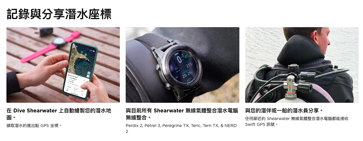每台啟用了發射器(TX)的 Shearwater 潛水電腦都能透過 Swift GPS 鎖定您的潛水點位置坐標。當您記錄潛水的進入點和離開點,並將地圖添加到您的 Dive Shearwater 潛水日誌中時,您將獲得比氣體整合更多的好處。